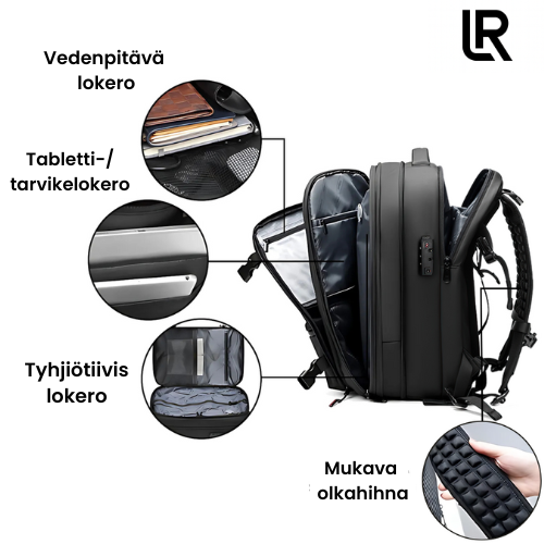 • Ostin tämän repun matkustamista varten, ja tyhjiöpakkausjärjestelmä on mahtava. viikoksi vaatteet ja se pitää tavarani pienenä ja järjestyksessä, ja vetoketjut sekä kangas ovat todella vahvoja. Suosittelen kaikille, jotka haluavat hyvän ja mukavan repun.