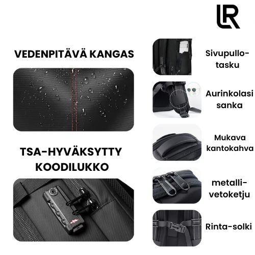 Repussamme on kannettavan tietokoneen osasto, järjestystaskut, kenkäosasto ja ammattimainen, tyylikäs ulkonäkö, joka sopii työmatkoille. Kompressio-ominaisuus mahdollistaa 7–14 päivän työvaatteiden pakkaamisen käsimatkatavarakokoon, välttäen ruumaan menevien laukkujen maksut ja viivästykset.