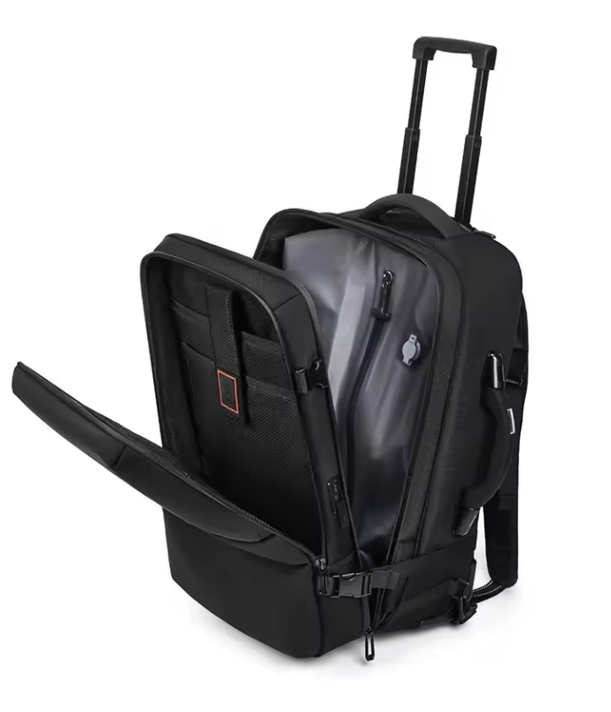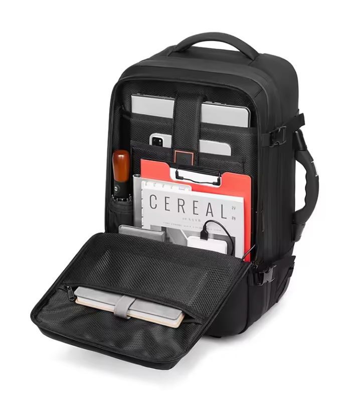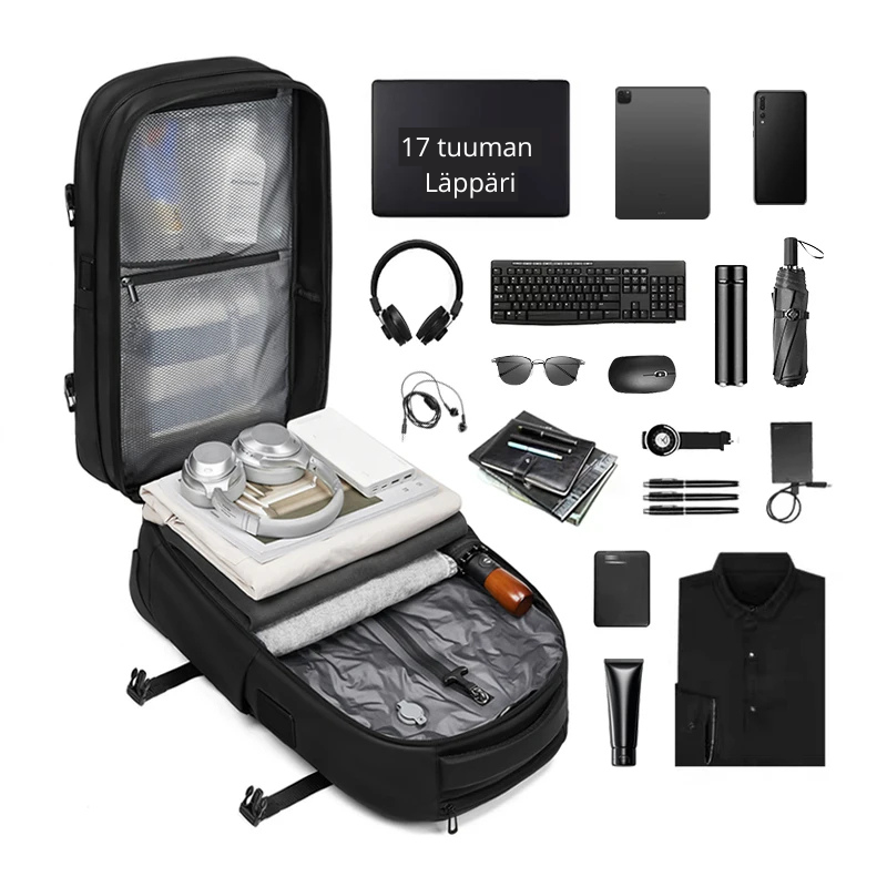 Repussamme on kannettavan tietokoneen osasto, järjestystaskut, kenkäosasto ja ammattimainen, tyylikäs ulkonäkö, joka sopii työmatkoille. Kompressio-ominaisuus mahdollistaa 7–14 päivän työvaatteiden pakkaamisen käsimatkatavarakokoon, välttäen ruumaan menevien laukkujen maksut ja viivästykset.